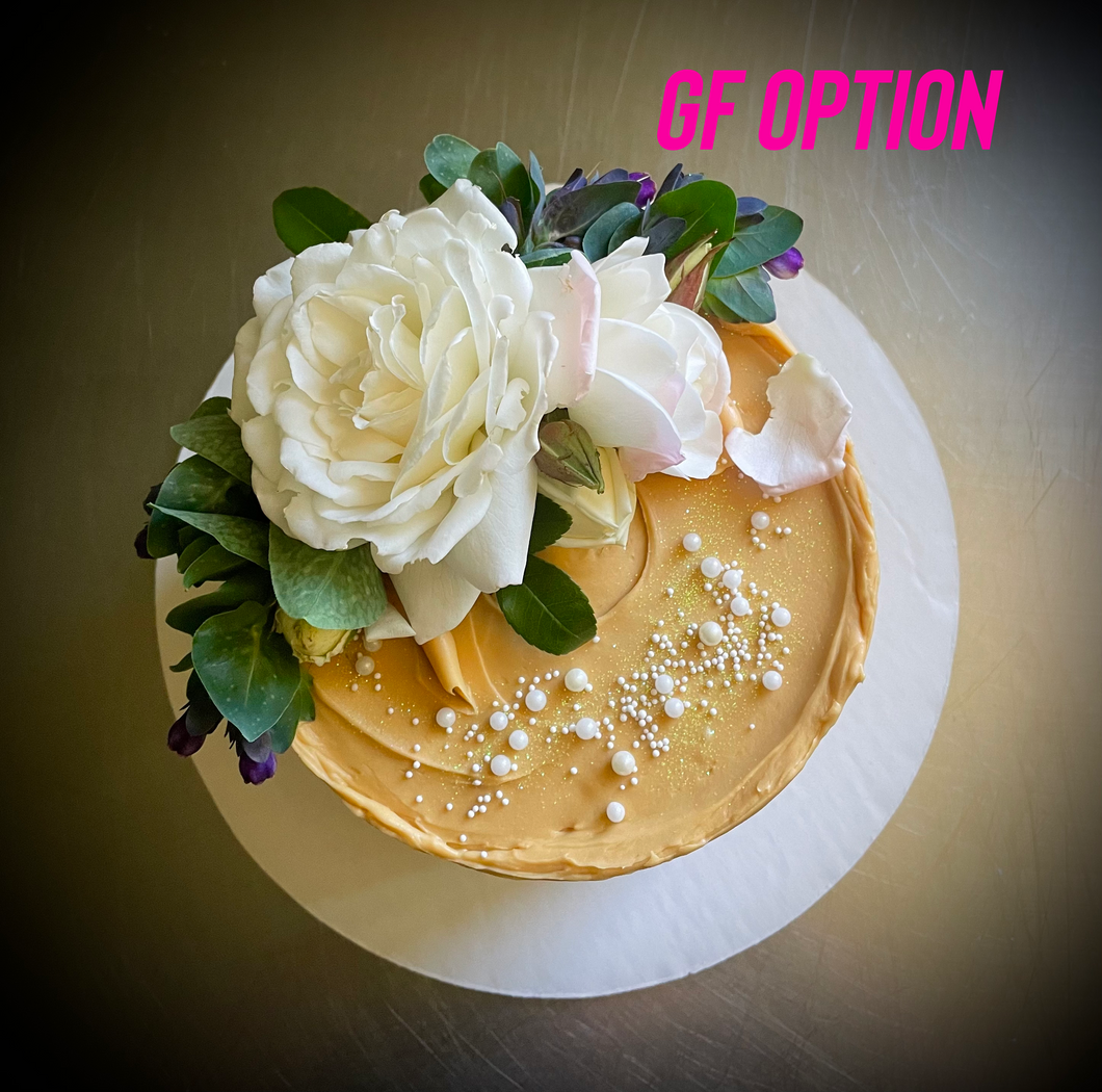 3 layers of moist, dark chocolate cake filled and finished with salted caramel buttercream... and a drizzle of Glarmer locally made olive oil. Filled with caramelized Rice Krispies for a bit of crunch!